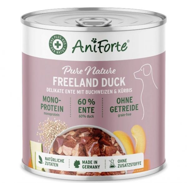 60,0% Ente (bestehend aus Fleisch, Herzen, Hälsen, Leber) 26,1% Brühe, 4,0% Kürbis, 4,0% Buchweizen, 2,0% Aprikose, 2,0% Zucchini, 1,0% Brombeeren, 0,03% Rosmarin, 0,03% Majoran, 0,03% Thymian, 0,1% Borretschöl, 0,1% Kokosraspeln, 0,1% Rapsöl, 0,1% Hagebuttenpulver, 0,1% Kieselerde, 0,1% Seealgenmehl, 0,1% Meeresalgenkalk, 0,1% Omega-3 Fischmehl