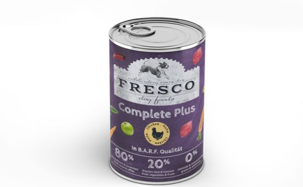 FRESCO Complete Plus Huhn wird aus Muskelfleisch und Innereien vom Huhn, frischem Obst und Gemüse sowie wertvollen Ölen in einem speziellen Verfahren hergestellt, das Vitamine und Nährstoffe erhält.