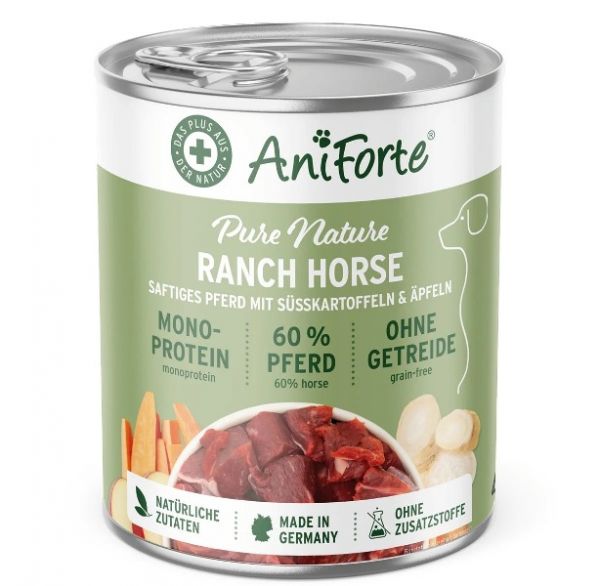 60,0% Pferd (bestehend aus Muskelfleisch, Herz, Lunge) 28,8% Brühe, 5,0% Süßkartoffel, 3,0% Pastinake, 2,0% Apfel, 0,3% Eierschalenpulver, Kamille, Fenchelsamen, Petersilie, 0,1% Kokosraspeln, 0,1% Hanföl, 0,1% Nachtkerzenöl, 0,1% Kieselerde, 0,1% Meeresalgenkalk, 0,1% Omega-3 Extrakt