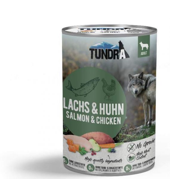 68,9% Huhn (bestehend aus Hühnermuskelmägen, Hühnerherzen, Hühnerfleisch, Hühnerleber, Hühnerfleischbrühe), 18% Lachs, 4% Süsskaroffeln, 2% Karotten, 2% Blaubeeren, 2% Cranberries, 2% Äpfel, 1% Mineralstoffe, 0,1% Petersilie