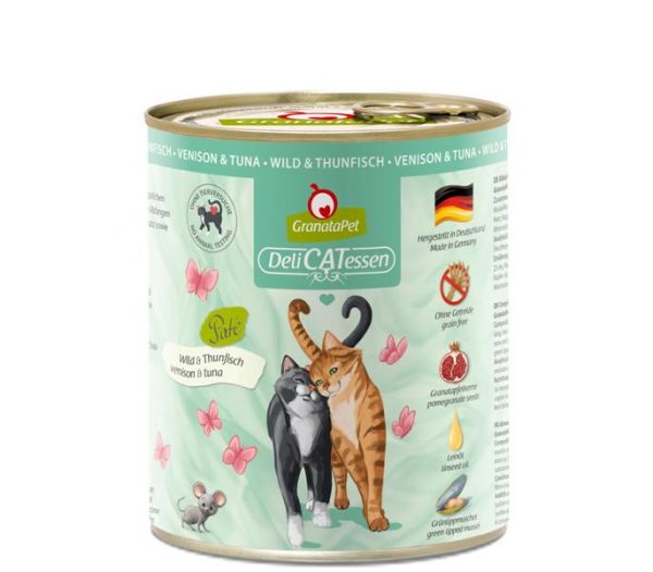 Zusammensetzung: Wildfleisch, Thunfisch und Hühnerfleisch 72% (Wild 22% bestehend aus Muskelfleisch, Herz, Lunge, Leber und Thunfisch 20% und Huhn 30% bestehend aus Muskelfleisch, Herz, Geflügelmagen, Leber), Wild-, Thunfisch- und Hühnerbrühe 24,9%, Granatapfelkerne 1%, Leinöl 1%, Mineralstoffe 1%, Grünlippmuschel 0,1%