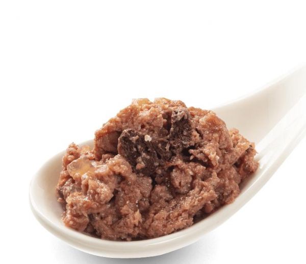 Zusammensetzung: Wildfleisch, Thunfisch und Hühnerfleisch 72% (Wild 22% bestehend aus Muskelfleisch, Herz, Lunge, Leber und Thunfisch 20% und Huhn 30% bestehend aus Muskelfleisch, Herz, Geflügelmagen, Leber), Wild-, Thunfisch- und Hühnerbrühe 24,9%, Granatapfelkerne 1%, Leinöl 1%, Mineralstoffe 1%, Grünlippmuschel 0,1%