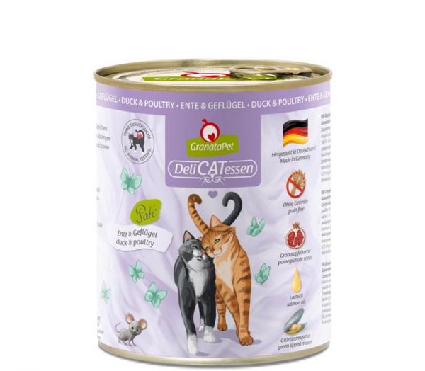 Zusammensetzung: Enten- und Geflügelfleisch 72% (Ente 36% bestehend aus Muskelfleisch, Herz, Magen und Geflügel 36% bestehend aus Muskelfleisch, Herz, Geflügelmagen, Leber), Enten- und Geflügelbrühe 24,9%, Granatapfelkerne 1%, Lachsöl 1%, Mineralstoffe 1%, Grünlippmuschel 0,1%