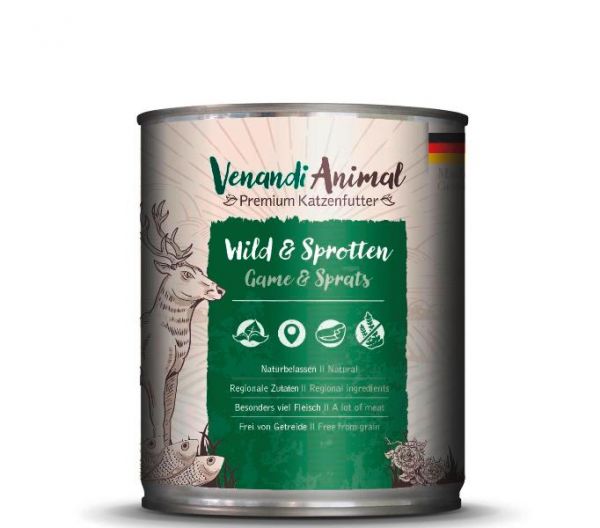 Wildfleisch 37,5%, Sprotten 32%, Fleischbrühe 30%, Mineralstoffe 0,5%