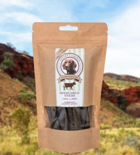 Pure, sortenreine Rindfleisch Sticks aus schlachtfrischen Rohprodukten - aufwändig schonend luftgetrocknet für viel Geschmack. Frei von Farb- und Konservierungsstoffen.