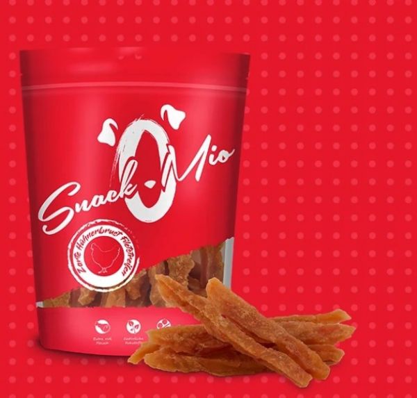 SnackOMio saftige Hühnerbrust Filetstreifen ist ein natürlicher Snack, schonend luftgetrocknet, getreidefrei, zucker frei und ohne chemische Zusätze.