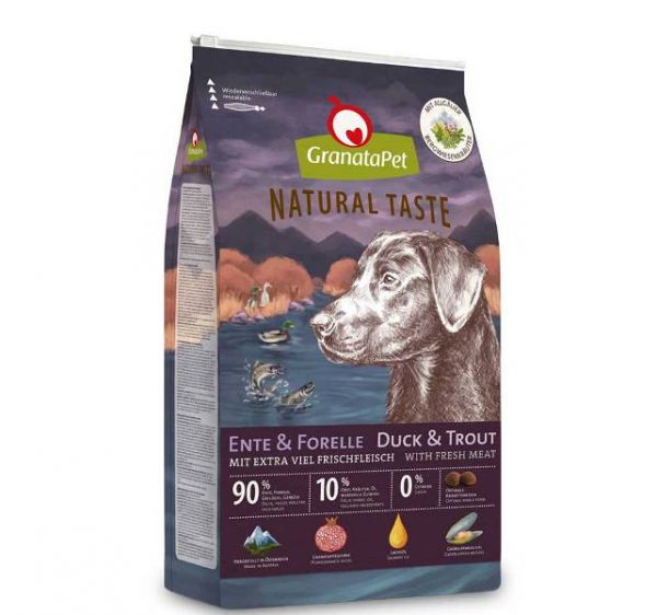 Ente, Forelle und Geflügel 70% (frisches Entenfleisch 20%, frische Forelle 15%, frisches Geflügelfleisch 15%, Entenfleisch getrocknet und fein vermahlen 5%, Forelle getrocknet und fein vermahlen 5%, Geflügelfleisch getrocknet und fein vermahlen 5%, Geflügelfett 5%), Gemüse 20% (Kartoffelflocken, Spinat, Karotten), Granatapfelkerne 4% (getrocknet und fein vermahlen), Lachsöl 2%, Mineralstoffe 1,5%, Vitamine 0,5%, Allgäuer Bergwiesenkräuter 0,5% (Bockshornklee, Breitwegerich, Spitzwegerich, Kamille, Löwenzahn, Ringelblume), Chicorée 0,5% (fein vermahlen, mit natürlichen FOS und Inulin), Kräuter 0,3% (Pfefferminze, Thymian, Oregano, Salbei, Petersilie, Majoran, Anissamen ), Früchte 0,3% (Cranberrys, Heidelbeeren, Äpfel ), Algen 0,2% (Knotentang, Spirulina ), neuseeländische Grünlippmuschel 0,1% (fein vermahlen, von Natur aus reich an Glucosamin und Chondroitin), Yucca schidigera 0,1%