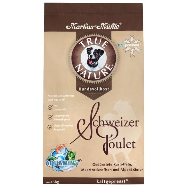 Schweizer Pouletfleisch aus tierfreundlicher Haltung, Eismeertrockenfisch, gedünstete Kartoffeln und Alpenkräuter machen True Nature zu einem ganz besonderen Hundefutter.