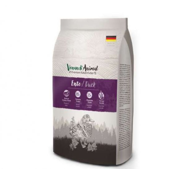 Ein starkes Stück - Venandi Trockenfutter Ente garantiert durch die nativen und exquisiten Zutaten einen unvergleichlichen Geschmack sowie die Versorgung Ihrer Katze mit allen wichtigen Nährstoffen. Auch für Katzen mit empfindlicher Verdauung ist Venandi Trockenfutter Ente bestens geeignet, da die ausgewählte Rezeptur mit hochwertigen Proteinquellen zu einer sehr hohen Verträglichkeit führt.